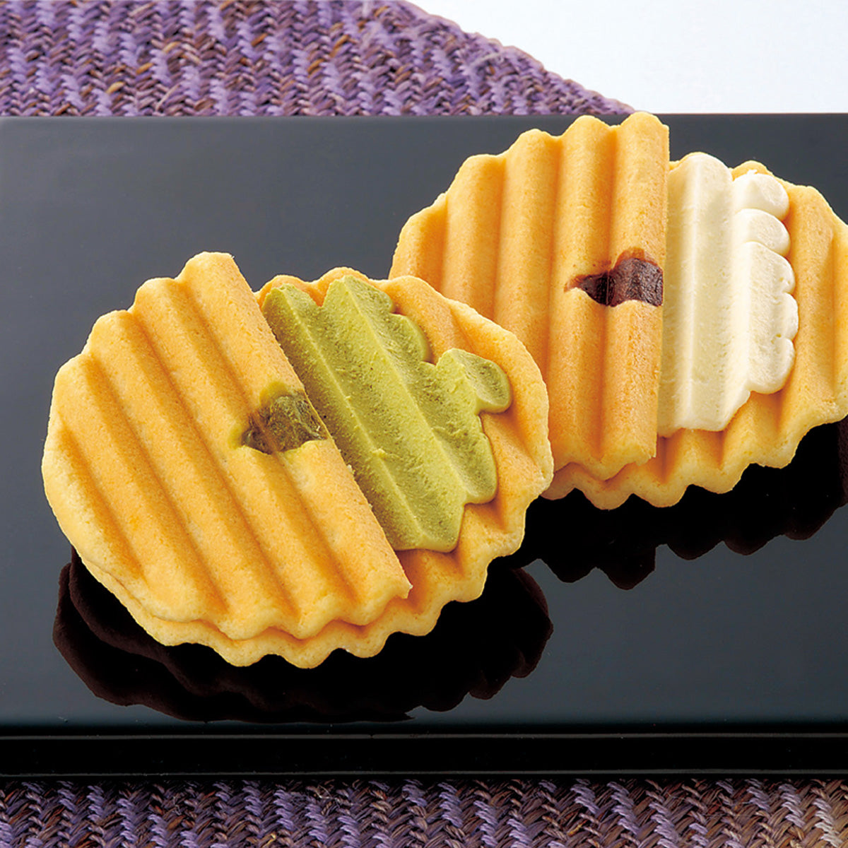 ヴァッフェルという種類の欧風せんべい。クッキー生地になめらかなクリームをはさんでいます。日保ち:60日