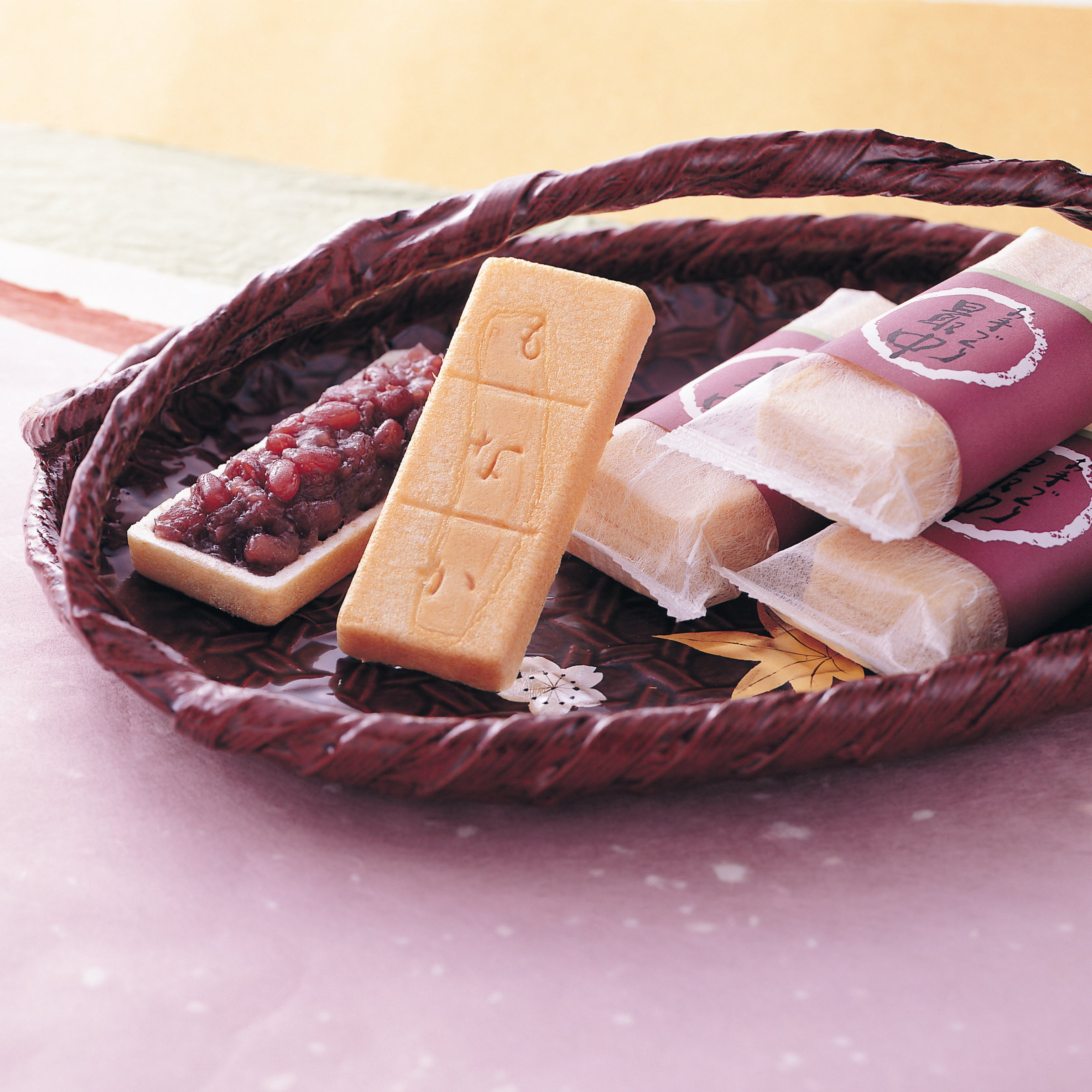 上皇献上菓。上品な口どけの良いこし餡をお餅で包み、ふやき煎餅ではさんだお菓子です。日保ち:約14日